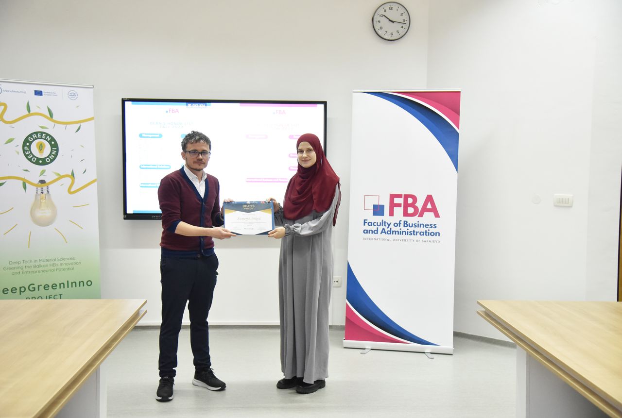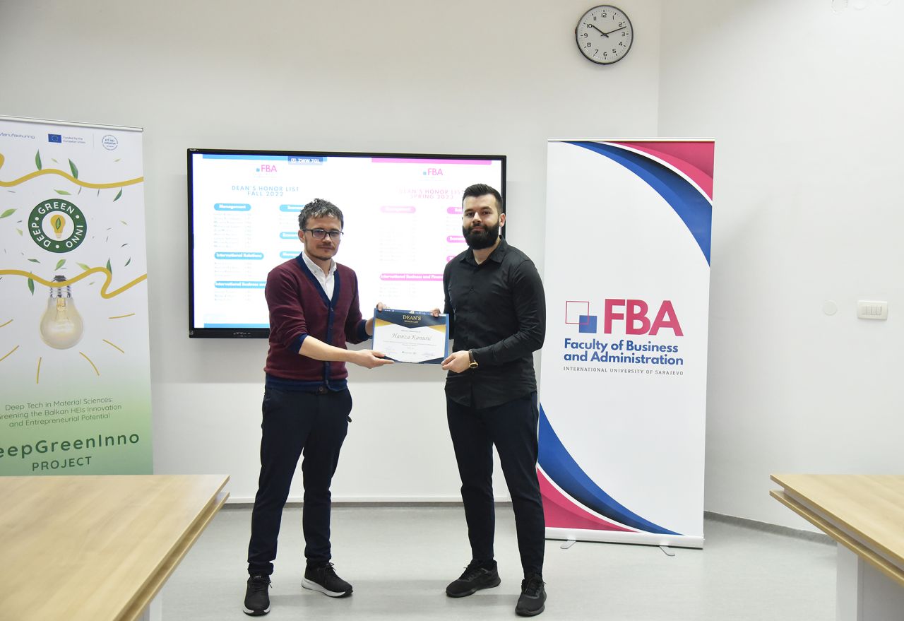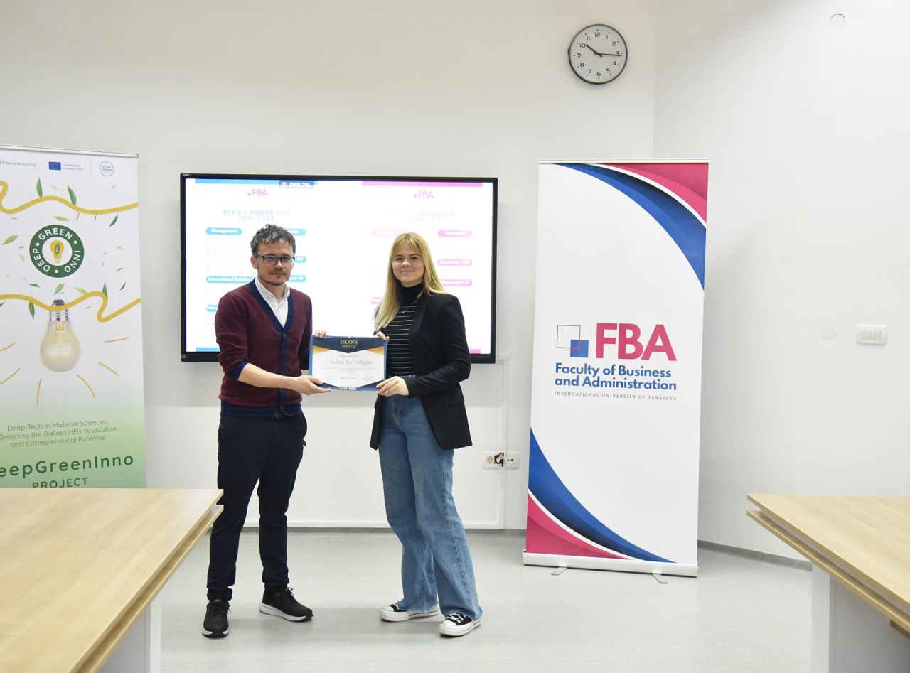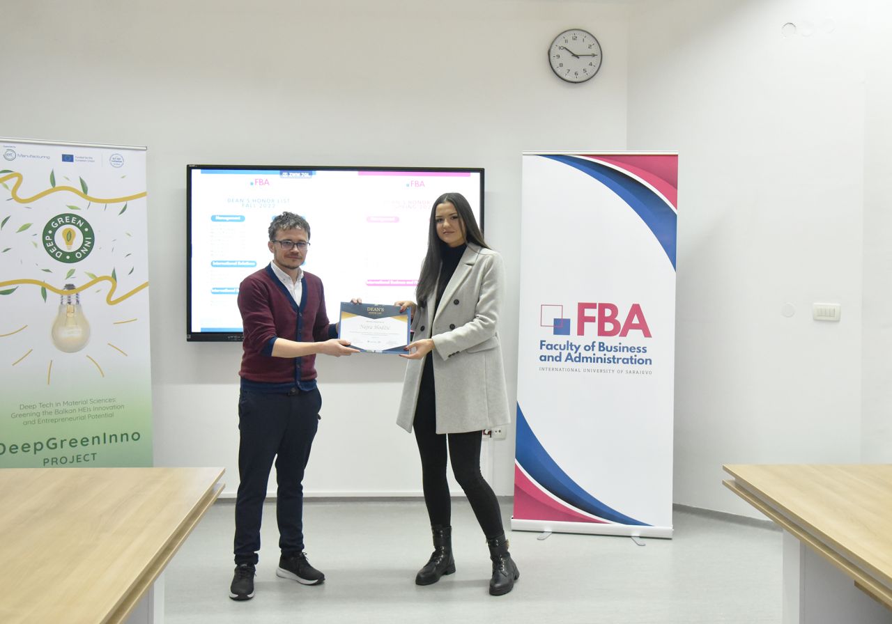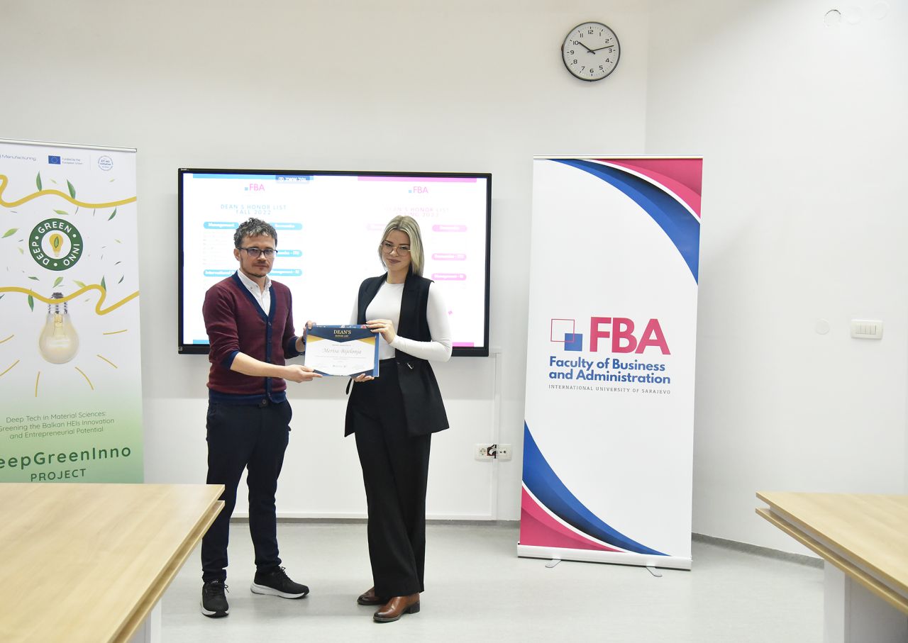 The Dean’s Honor List Award Ceremony was held on February 21, 2024, at the Faculty of Business and Administration (FBA). The ceremony was attended by Assoc. Prof. Dr. Emil Knezović (FBA Dean), Asst. prof. Dr. Šejma Aydin (MAN/ECON/IBF Program Coordinator), and Assoc. Prof. Dr. Aliaksandr Novikau (PSIR Program Coordinator).