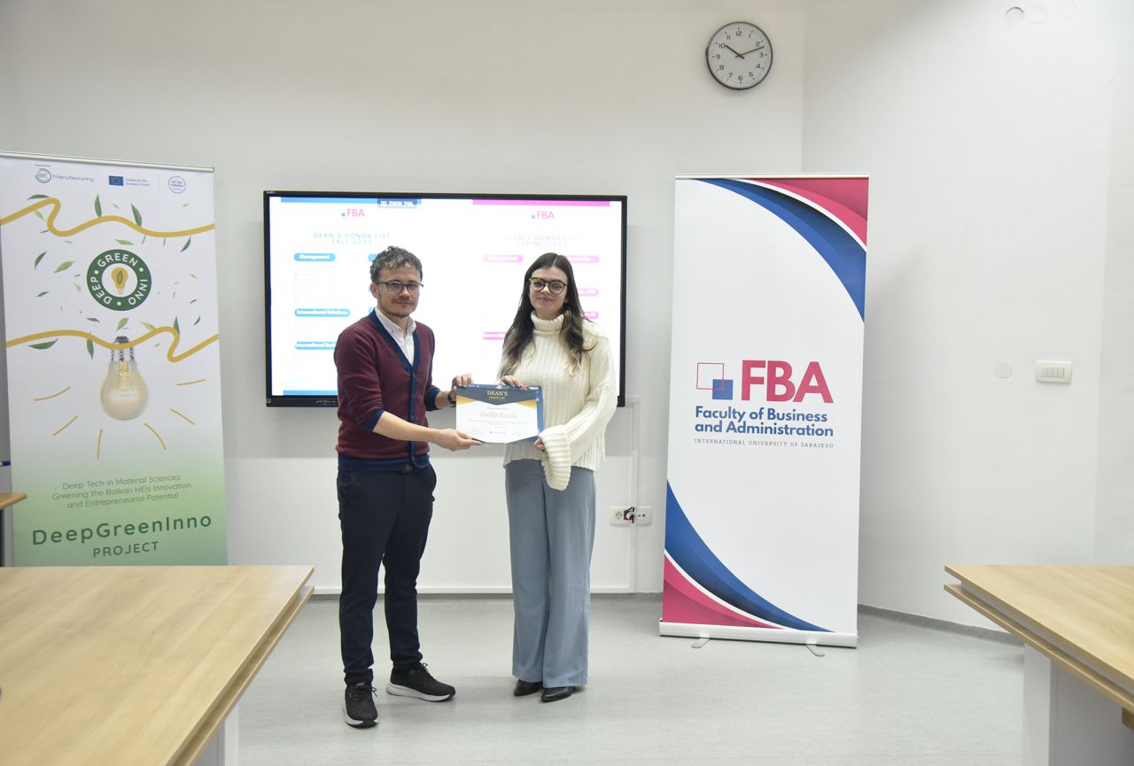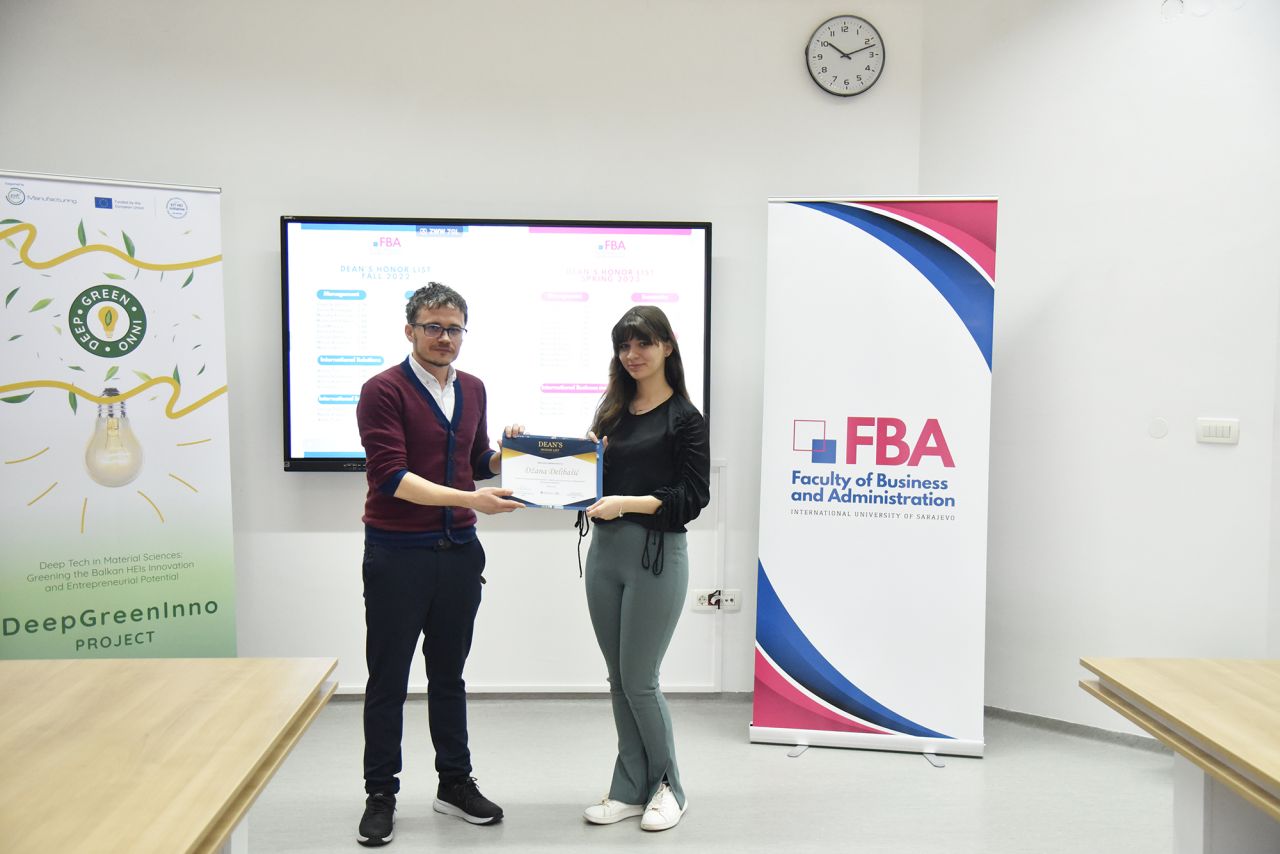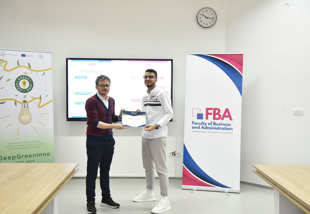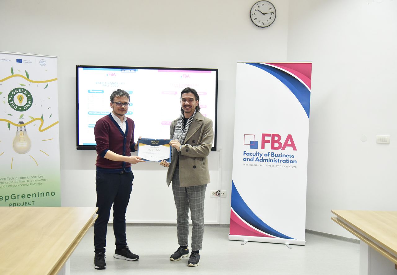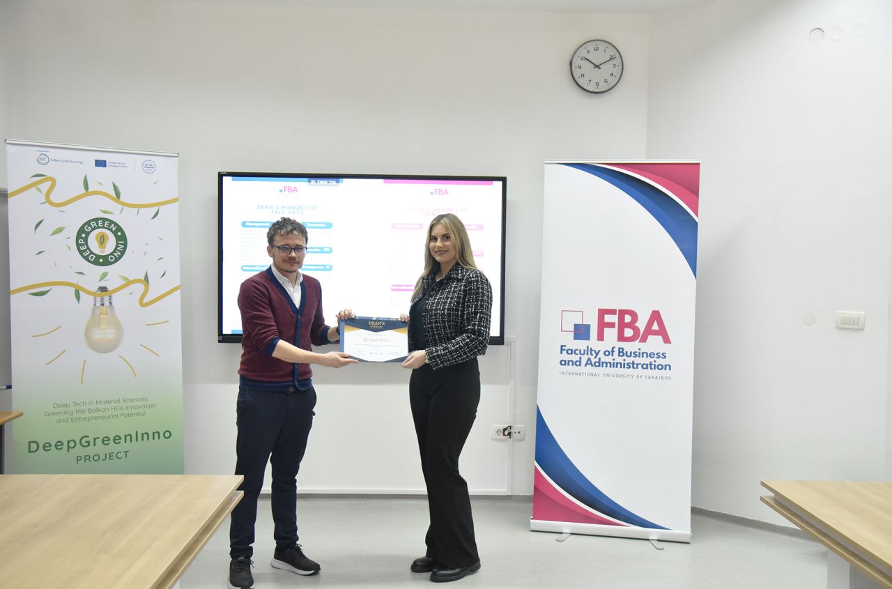 The Dean’s Honor List Award Ceremony was held on February 21, 2024, at the Faculty of Business and Administration (FBA). The ceremony was attended by Assoc. Prof. Dr. Emil Knezović (FBA Dean), Asst. prof. Dr. Šejma Aydin (MAN/ECON/IBF Program Coordinator), and Assoc. Prof. Dr. Aliaksandr Novikau (PSIR Program Coordinator).
