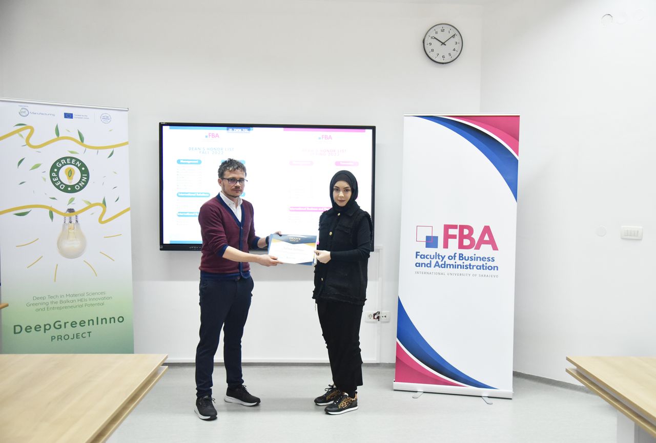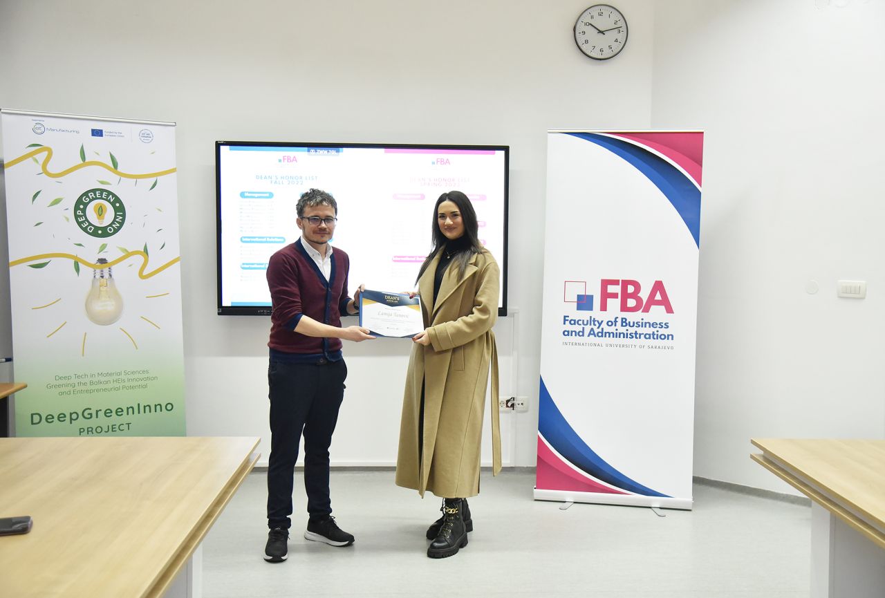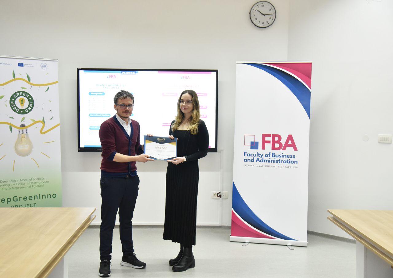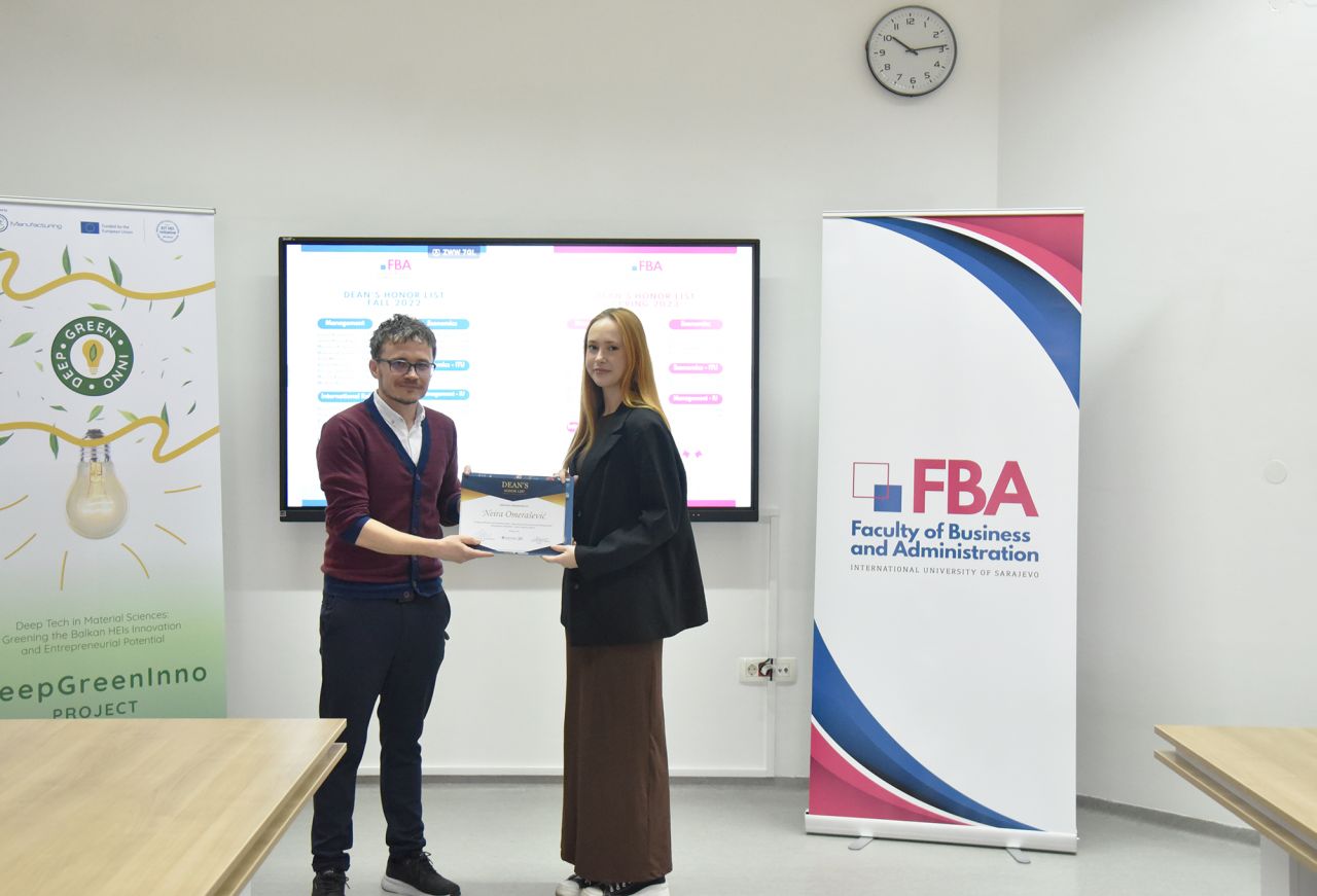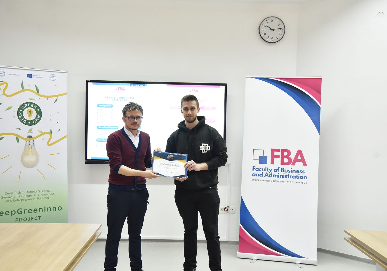 The Dean’s Honor List Award Ceremony was held on February 21, 2024, at the Faculty of Business and Administration (FBA). The ceremony was attended by Assoc. Prof. Dr. Emil Knezović (FBA Dean), Asst. prof. Dr. Šejma Aydin (MAN/ECON/IBF Program Coordinator), and Assoc. Prof. Dr. Aliaksandr Novikau (PSIR Program Coordinator).