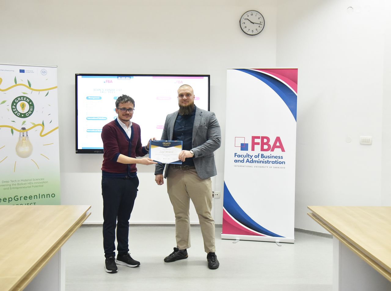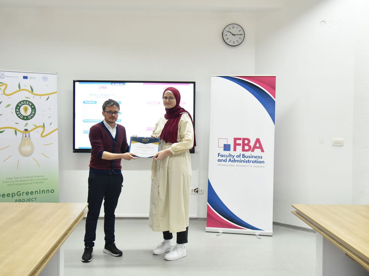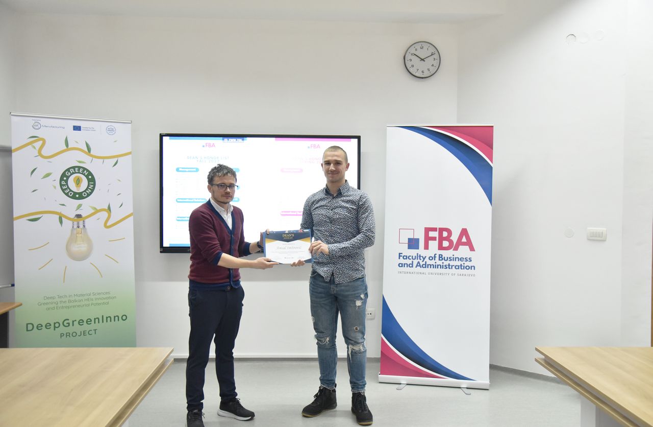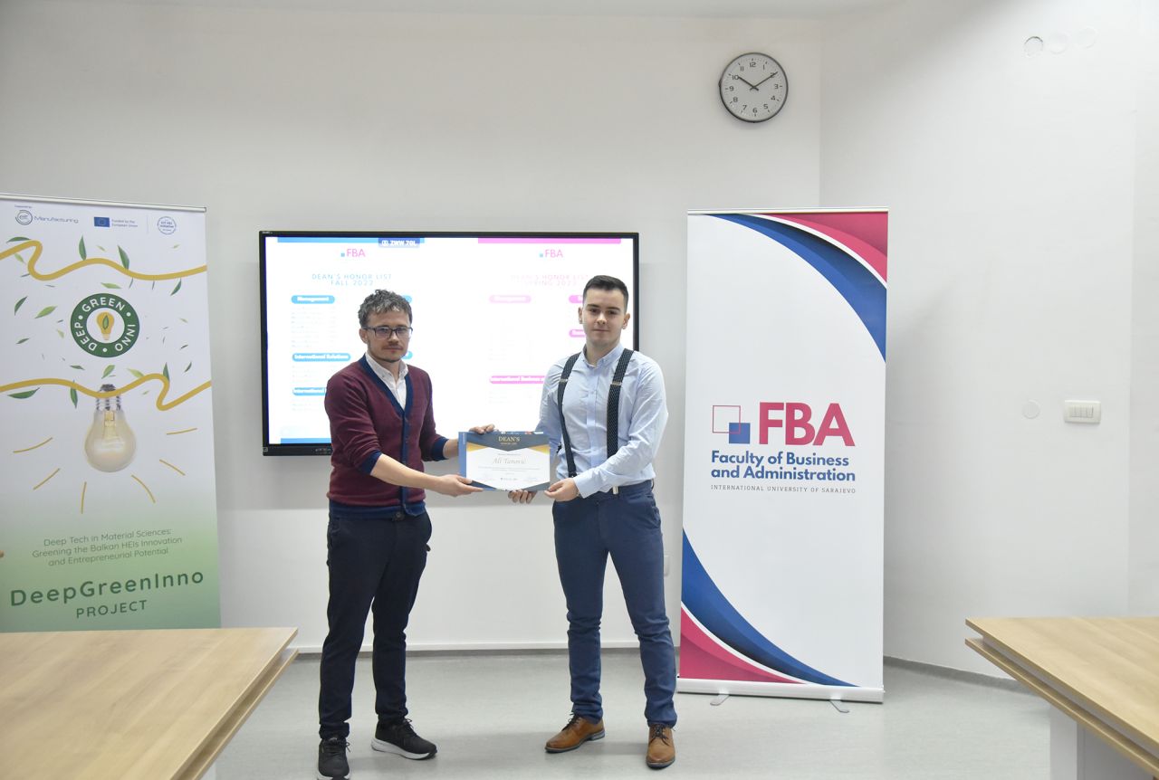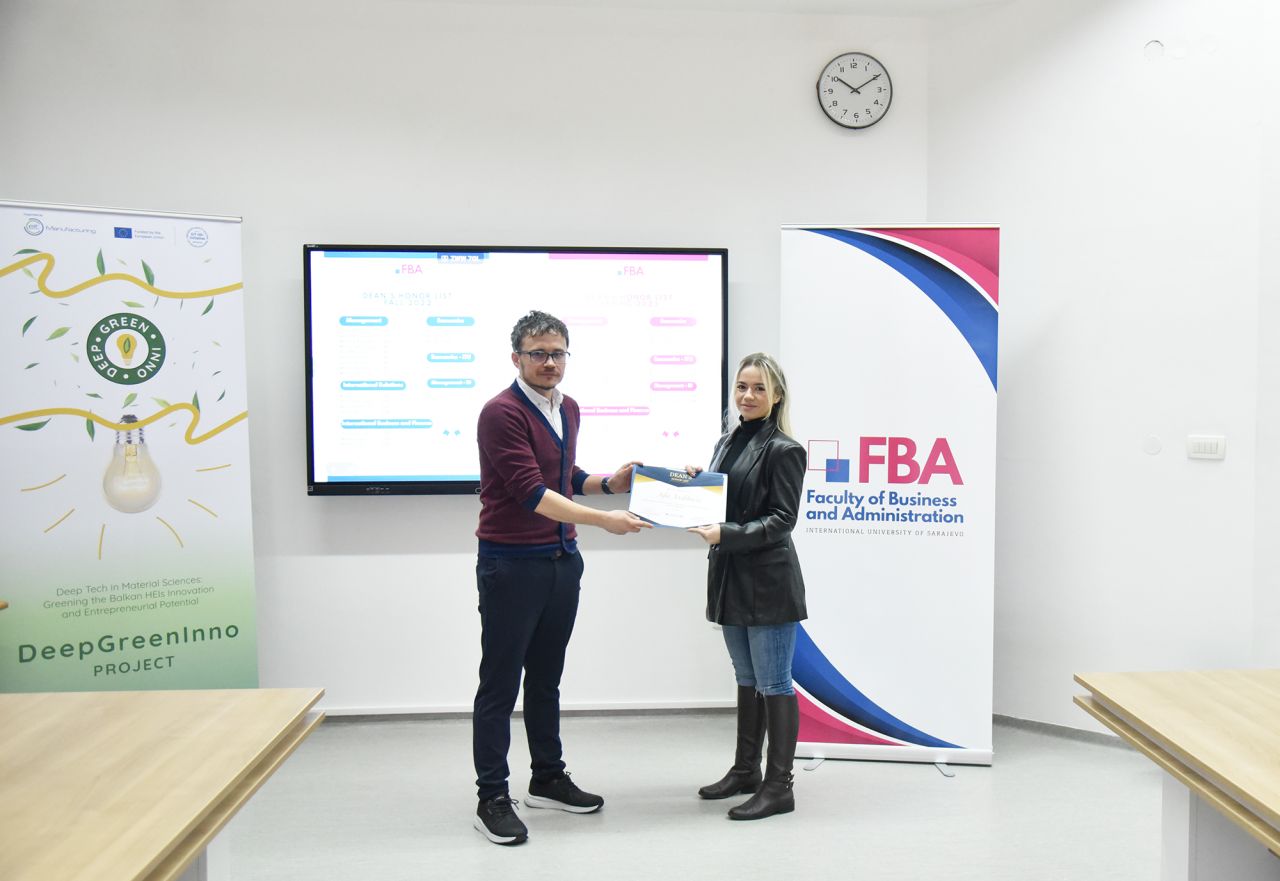 The Dean’s Honor List Award Ceremony was held on February 21, 2024, at the Faculty of Business and Administration (FBA). The ceremony was attended by Assoc. Prof. Dr. Emil Knezović (FBA Dean), Asst. prof. Dr. Šejma Aydin (MAN/ECON/IBF Program Coordinator), and Assoc. Prof. Dr. Aliaksandr Novikau (PSIR Program Coordinator).
