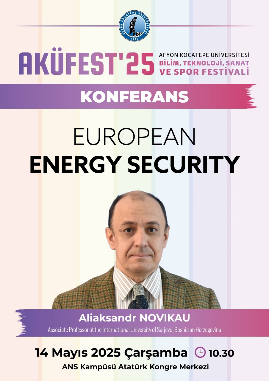 On Wednesday, May 14, 2025, Associate Professor Dr. Aliaksandr Novikau, from the Political Science and International Relations (PSIR) study program, delivered a lecture on European Energy Security at Afyon Kocatepe University (AKU) in Türkiye. The lecture was a highlight of AKU Science, Technology, Art, and Sports Festival (AKÜFEST’25) – a traditional annual event designed to provide educational, cultural, social, and recreational opportunities for students and the wider university community.
